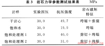 評(píng)價(jià)井壁穩(wěn)定處理劑綜合性能的重要方法之一就是測(cè)量對(duì)比飽和處理劑與飽和水的巖石力學(xué)參數(shù)變化。室內(nèi)采用聚合物處理劑浸泡過的泥巖巖樣進(jìn)行巖石力學(xué)參數(shù)測(cè)試。實(shí)驗(yàn)結(jié)果見表3。