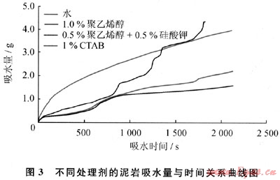 對(duì)比吸水量與時(shí)間關(guān)系曲線可知,泥巖在清水中的吸水量上升的最快,同一時(shí)間內(nèi)吸水量也最大。從總吸水量上來看,聚乙烯醇大于CTAB潤濕反轉(zhuǎn)劑,大于聚乙烯醇和硅酸鉀混合溶液,說明聚乙烯醇和硅酸鉀混合溶液的抗毛細(xì)管力自吸能力很好。CTAB潤濕反轉(zhuǎn)劑相對(duì)封堵型的處理劑,吸水量還是略高,抑制效果稍差。通過此項(xiàng)實(shí)驗(yàn),能有效地模擬評(píng)價(jià)處理劑抑制泥頁巖自吸水的性能。