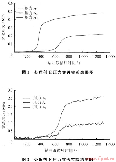 實(shí)驗(yàn)采用處理劑E、F對(duì)同一深度的井下巖心進(jìn)行了壓力穿透測(cè)試,結(jié)果見圖1、2。