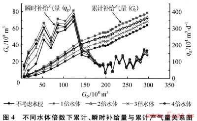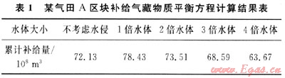 3) 在不同的水體大小情況下,計算區(qū)塊的補給量大小,計算結果顯示水體倍數(shù)應該大于2倍,與前期地質分析結論相符。水體倍數(shù)越大、水侵量越大,則區(qū)塊間氣體的補給量會減少。區(qū)塊間的壓力差是影響氣體補給量大小的重要因素。