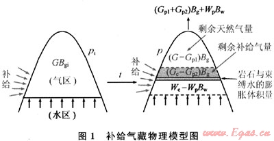 1936年,Schilthus首先推導出體積物質平衡方程,此方法可以簡單有效的估算地層內原始氣體和氣藏枯竭各階段天然氣儲量,是油氣藏動態(tài)分析的一種標準的油氣藏丁程工具。筆者借鑒物質平衡原理[2,13~15],將氣藏模擬為單獨儲罐體,并考慮有外來天然氣及水體通過薄的可滲透邊界不斷流入氣藏的情況下建立新的補給氣藏物理模型(圖1)。