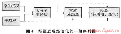 總之,有機(jī)質(zhì)成烴是系列的演化過(guò)程(圖4),大分子非烴類(lèi)是成油的最直接母源,其成因除傳統(tǒng)地認(rèn)為由干酪根降解形成外,在保存較好的條件下(如咸水環(huán)境)可在沉積過(guò)程中直接形成,這種情況一般也與低熟油的形成有關(guān),即原生沉積的非烴類(lèi)有機(jī)大分子早期降解可形成低熟油。而干酪根由于所處烴源巖條件的差異可發(fā)生不同期的降解,按序列形成各類(lèi)產(chǎn)物。重質(zhì)液態(tài)烴開(kāi)始形成時(shí)烴源巖真正進(jìn)入生烴階段,依次進(jìn)行其后各級(jí)別的降解。該序列是演化的主體過(guò)程,但在每一級(jí)降解的過(guò)程中,都會(huì)伴隨生成其他級(jí)別的產(chǎn)物,不同的生烴階段所處的降解級(jí)別也有差異。