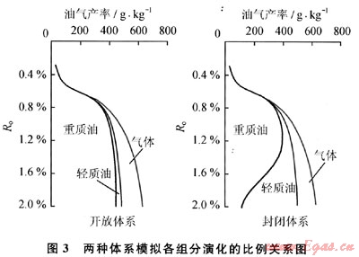 通過(guò)計(jì)算,大致可以獲取官107井樣品模擬過(guò)程中輕質(zhì)油的產(chǎn)率,并與重質(zhì)油、氣態(tài)烴對(duì)比以分析它們的比例關(guān)系(圖3)。從理論上講,如果烴源巖形成的產(chǎn)物能夠及時(shí)運(yùn)移出去,則在烴源巖中發(fā)生二次裂解的程度較小,如果生成的產(chǎn)物不能及時(shí)排出,則可以在烴源巖中較多地發(fā)生二次裂解,造成一次裂解與二次裂解的疊加現(xiàn)象。由于兩種體系模擬條件下生成的氣體量大致相當(dāng),則可知二者生成的總油量(重質(zhì)油+輕質(zhì)油)也基本相當(dāng),封閉體系重質(zhì)油二次裂解的主要產(chǎn)物為輕質(zhì)油,其主要的形成階段在重質(zhì)油達(dá)生烴高峰之后(Ro為1.0%~1.2%),隨演化二次裂解程度增大,輕質(zhì)油產(chǎn)率增大。又由于烴源巖演化過(guò)程中的生排烴動(dòng)平衡關(guān)系,生成大量輕質(zhì)油后烴源巖即已進(jìn)入大規(guī)模排油期,再次裂解的程度是有限的,即生成氣體的比率并不是很高。
