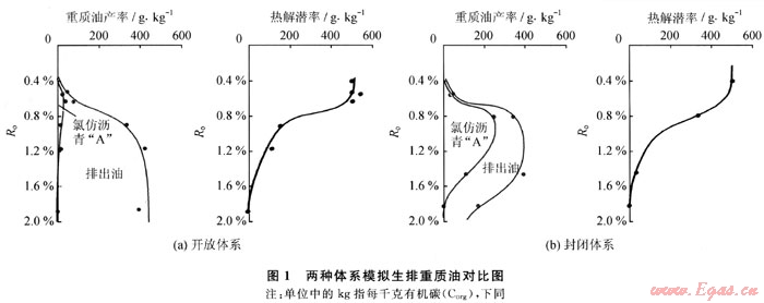 在兩種體系的模擬實(shí)驗(yàn)中形成了不同數(shù)量的重質(zhì)油,并以不同效率的排出(圖1)。開(kāi)放體系生成的重質(zhì)油,殘留的部分(即氯仿瀝青“A”含量)較少,只在Ro=0.6%附近呈略微增高的趨勢(shì),其后隨演化一直處于下降階段。在Ro=0.5%之后即開(kāi)始排油,主生油階段大部分重質(zhì)油即已排出,是由于其生成以后缺少壓力的抑制作用所致。重質(zhì)油總量在Ro=1.0%之前增加速度較快,Ro=1.0%時(shí)的高演化階段變化趨于平緩。這種情形與地下差別較大,即地下烴源巖的生排烴不可能處于完全開(kāi)放的體系中。