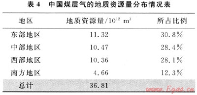 中國(guó)煤層氣的地質(zhì)資源量分布情況如表4所示。其中,埋深2000m以內(nèi)的煤層氣資源量為36.8×1012m3;埋深1500m以內(nèi)的可采資源量為10.9×1012m3。