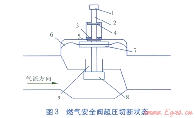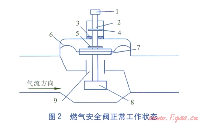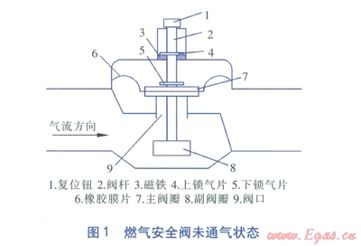 如圖l所示,此型號燃?xì)獍踩y在未通氣狀態(tài)下,閥瓣在重力作用下下落,磁鐵3吸附上鎖氣片4,主閥瓣7關(guān)閉閥口9,燃?xì)獍踩y處于切斷狀態(tài)。當(dāng)燃?xì)獍踩y通氣后,若不上提復(fù)位鈕進行手動復(fù)位,燃?xì)獍踩y進睜壓力無法克服磁鐵3吸附上鎖氣片4的磁力作用,燃?xì)獍踩y將一直處于如圖l所示的切斷狀態(tài)。