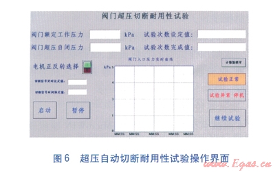 每一個耐用性試驗均存在其獨立的操作界面,并將全部界面顯示于一個綜合界面上,界面的切換采用彈出窗口的方式。燃?xì)獍踩y的超壓自動切斷耐用性試驗的操作界面見圖6。