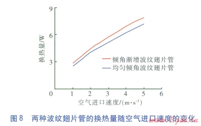 兩種波紋翅片管的換熱量隨空氣進(jìn)口速度的變化見圖8。由圖8可知,兩種波紋翅片管的換熱量隨空氣進(jìn)口速度的增大而增加,換熱量與空氣進(jìn)口速度近似為線性關(guān)系。在相同工況下,傾角漸增波紋翅片管的換熱效果優(yōu)于均勻傾角波紋翅片管。
