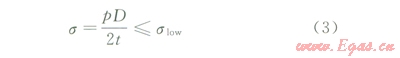 式中P為管道試壓壓力或運行壓力,MPa;D為管道外徑,m;t為管道壁厚,m;s為內(nèi)壓產(chǎn)生的環(huán)向應(yīng)力,應(yīng)不超過管道的屈服強度,MPa。