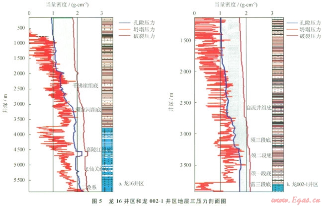 把九龍山構(gòu)造地應(yīng)力狀態(tài)和巖石力學(xué)參數(shù)有機結(jié)合起來,計算獲得九龍山構(gòu)造的龍16井區(qū)和龍002-l井區(qū)地層三壓力剖面(圖5)。