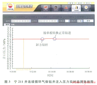 寧211井是四川省南部邊緣長(zhǎng)寧背斜構(gòu)造的一口評(píng)價(jià)井。Æ215.9mm井眼鉆進(jìn)的韓家店組一石牛欄組為粉砂巖、頁(yè)巖夾石灰?guī)r,鉆井液鉆井存在鉆速慢,漏失量大等難題。采用氮?dú)忏@井鉆進(jìn)至井深1482.22m開(kāi)始連續(xù)循環(huán)鉆井系統(tǒng)試驗(yàn),主要目的是檢驗(yàn)連續(xù)循環(huán)閥氣密封性、系統(tǒng)的可操控性、連續(xù)循環(huán)工藝的可行性。該井正常鉆進(jìn)時(shí),氮?dú)庾⑷肓?span lang="EN-US">l20m3/min,鉆進(jìn)時(shí)立壓2.6MPa。接單根總用時(shí)14min,先后完成了3次接單根連續(xù)循環(huán)作業(yè)(圖3),在側(cè)循環(huán)和正循環(huán)切換過(guò)程中,系統(tǒng)運(yùn)行平穩(wěn),井口壓力波動(dòng)小于0.07MPa,實(shí)現(xiàn)了接單根和起鉆作業(yè)的氣體連續(xù)循環(huán),達(dá)到了井底壓力恒定的效果。初步證實(shí)了連續(xù)循環(huán)工藝的可行性和系統(tǒng)的可靠性。