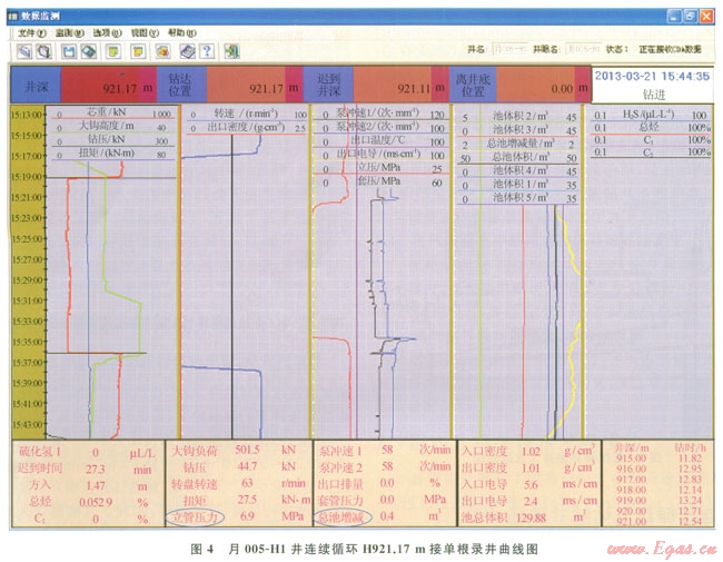 2013年3月21日,充氣鉆井至井深910.21m開(kāi)始試驗(yàn)連續(xù)循環(huán)鉆井系統(tǒng),目的在于檢驗(yàn)該系統(tǒng)在氣液混合條件下的密封能力、系統(tǒng)的可操控性,試驗(yàn)正循環(huán)與側(cè)循環(huán)相互轉(zhuǎn)換時(shí)壓力波動(dòng)大小等。該井試驗(yàn)井段910.21~927.15m,注氣量60m3/min,注液量45L/s,鉆進(jìn)時(shí)立壓7.0MPa。側(cè)循環(huán)和正循環(huán)切換過(guò)程中,系統(tǒng)運(yùn)行平穩(wěn)、可控性好,實(shí)現(xiàn)了氣液混合時(shí)的有效密封,接單根前后最高壓力波動(dòng)0.3MPa,池液面變化0.4m3(常規(guī)充氣鉆井液池液面波動(dòng)可達(dá)20m。)(圖4),順利實(shí)現(xiàn)了充氣鉆井接單根作業(yè)中井下連續(xù)循環(huán),確保了環(huán)空液柱當(dāng)量密度穩(wěn)定,有效地解決了充氣鉆井接單根后壓力波動(dòng)大的問(wèn)題,可避免由于環(huán)空液柱當(dāng)量密度變化造成的井漏,較為準(zhǔn)確判斷井下溢流情況,提高充氣鉆井的安全性。