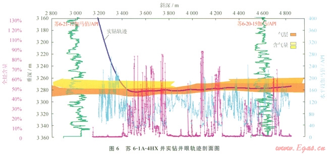 蘇里格氣田儲層含氣砂體薄,傾角變化大,LWD測點監(jiān)測儲層信息滯后于鉆頭位置,實鉆過程中井眼軌跡調整頻繁,砂體有效鉆遇率低。為提高氣層有效鉆遇率,提高鉆井速度,針對軌跡控制難題,通過鉆具力學分析與儲集砂體走向評價,改變了以往的鉆具組合,實施近鉆頭測量[14],形成了“精確監(jiān)控、緩慢糾偏、斜有余地、穩(wěn)斜探頂”的軌跡控制技術。該項技術能夠及時掌握實鉆軌跡,并根據地質提示提前做出調整,避免軌跡大幅度變化,降低了軌跡控制難度,提高了砂體有效鉆遇率,縮短了鉆井周期。2010年該技術在蘇61A-4HX井應用,實現了砂層鉆遇率85.6%,氣層(含氣層)鉆遇率67.6%的突破(圖6)。2011年該技術在蘇里格氣田實現規(guī)模應用,先后鉆井l63口,平均砂巖鉆遇率81.4%,氣層(含氣層)鉆遇率65.5%。