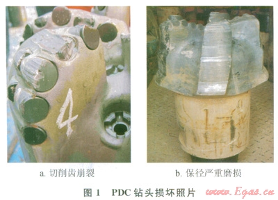 蘇里格氣田屬于非均質性極強的致密巖性氣田,儲層深度達3500m,鉆遇地層中的白堊系、侏羅系、三疊系、二疊系等地層硬度高、可鉆性差,其中紙坊組一石千峰組為含礫石夾層砂巖,鉆時極慢,直井段平均機械鉆速5.37m/h,斜井段復合鉆進平均機械鉆速1.01m/h,滑動鉆進平均機械鉆速0.35m/h。鉆進時蹩跳嚴重,往往造成PDC鉆頭切削齒崩裂、肩部齒脫落、保徑嚴重磨損等早期損壞(圖1)。