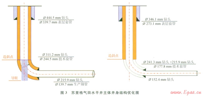 針對蘇里格氣田水平井Æ311.2mm鉆頭機械鉆速低、Æ203mm螺桿造斜率小、斜井段施工周期長、井壁穩(wěn)定性差等難題,通過理論研究和現場試驗,并參考井身結構設計方法[8]中套管與井眼之間環(huán)空的合理間隙[9],優(yōu)化形成蘇里格氣田水平井的彥273.1mmׯ177.8mm×裸眼的主體井身結構(圖3),表層井眼尺寸由Æ444.5mm優(yōu)化為Æ346.1mm,第二次開鉆使用尺寸Æ241.3mm的鉆頭鉆至造斜點,取消了導眼段,斜井段再采用Æ215.9mm鉆頭鉆至入窗點,下入Æ177.8mm技術套管,水平段優(yōu)化為Æl52.4mm井眼。