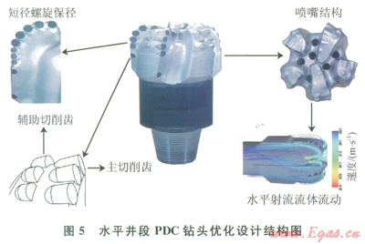 經過對蘇里格氣田巖石可鉆性、鉆頭破碎規(guī)律進行分析,并結合巖心、測井等資料,針對硬夾層設計了雙重保護切削結構,減小鉆頭震動,提高鉆頭抗沖擊能力及耐磨性[12]。根據鉆頭水平井段鉆進時水平射流流體流動場,調整鉆頭噴嘴的方位角和噴射角度,增加鉆頭排屑槽面積,降低水力能量對切削齒和刀翼體的沖蝕。此外,根據水平井段施工穩(wěn)斜的需要,設計了短徑螺旋保徑5刀翼結構,減小PDC鉆頭反扭矩,提高鉆頭定向和穩(wěn)斜能力[13](圖5)。
