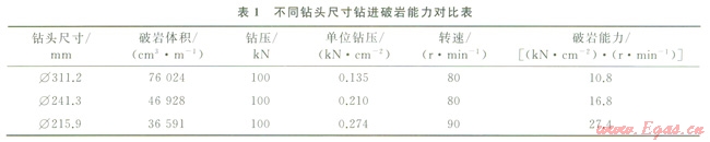 針對蘇里格氣田地層巖心可鉆性分析,并對不同鉆頭尺寸模擬水平井鉆進參數時的機械破巖能力進行對比,由表l可以看出,Æ215.9 mm鉆頭在一定條件下,破巖能力最強。斜井段優(yōu)化為Æ215.9mm井眼可大幅提高機械鉆速。