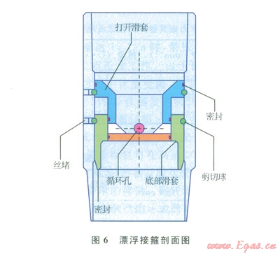 為了順利將Æl77.8mm套管下入長1200m的Æ215.9mm井眼內(nèi),在套管串中應(yīng)用了漂浮接箍(圖6)。漂浮接箍上部的套管柱灌入鉆井液,下部的套管內(nèi)部充滿空氣(沒有鉆井液),漂浮接箍下部套管入井后受到鉆井液的浮力作用降低了井壁對(duì)套管柱的摩擦阻力;而漂浮接箍上部的套管內(nèi)灌有鉆井液會(huì)增加套管柱的重量,確保套管順利入井。下到預(yù)定深度后向套管內(nèi)加壓,直到扣‘開滑套向下移動(dòng)讓鉆井液與空氣進(jìn)行交換。當(dāng)流動(dòng)穩(wěn)定后,整個(gè)套管柱內(nèi)都充滿了鉆井液投入下膠塞,注入水泥漿,浮鞋盲板打開。當(dāng)下膠塞坐定在滑套上后,剪斷銷釘,水泥漿就把下膠塞和漂浮接箍的兩個(gè)滑套一起下推向下部的浮箍下膠塞和兩個(gè)滑套坐定在浮箍上,并與浮箍密封。下膠塞破裂,水泥漿通過浮鞋泵出,頂替上膠塞,并與浮箍處的下膠塞和漂浮接箍組件形成密封,確保固井質(zhì)量。