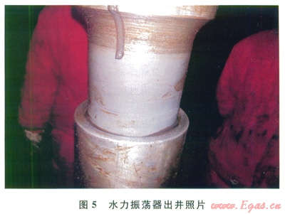 該井鉆至6069m,為了提高滑動(dòng)施工效率,水平段鉆具組合中應(yīng)用了水力振蕩器。根據(jù)水力振蕩器安裝原則,在鉆具組合中距離鉆頭位置的已鉆水平段長度的l/3處安裝,即該趟鉆中水力振蕩器距離鉆頭位置720m。在不同排量的情況下,在井口對(duì)水力振蕩器進(jìn)行壓力測試(表1)。下鉆到底后,泵沖65沖/min,泵壓23.0MPa,加壓至40~60kN,泵壓24.5~25.2MPa(未使用水力振蕩器時(shí),泵沖65沖/min,泵壓是23~25MPa)。復(fù)合鉆進(jìn)至井深6105m,進(jìn)尺36m后需要調(diào)整軌跡進(jìn)行滑動(dòng)鉆進(jìn),但活動(dòng)鉆具上提摩擦阻力18t,下放28~40t,經(jīng)過多次劃眼后,下放摩擦阻力依然較高,在20~30t(圖2),調(diào)整工具面依然困難,滑動(dòng)鉆進(jìn)效果差。進(jìn)行多次嘗試后,工具面依然調(diào)整困難。通過調(diào)整泵沖,改變排量,鉆進(jìn)至6415m,鵝頸管刺漏起鉆。起出水力振蕩器后井口測試,工具不工作,振動(dòng)短節(jié)不振動(dòng),而且振動(dòng)短節(jié)振動(dòng)處有膠皮露出,這可能導(dǎo)致其在使用進(jìn)尺36m后,不能起到傳遞鉆壓和振動(dòng)效果的原因(圖5)。