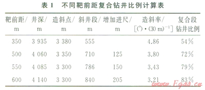 合理的靶前距可有效提高復(fù)合鉆井段比例,最大限度增加PDC鉆頭的使用井段,有助于提高機(jī)械鉆速;另外,合理的靶前距還可帶來最佳的造斜率,降低鉆具摩阻,有利于提高鉆井速度??偨Y(jié)水平井施工經(jīng)驗(yàn),推薦合理靶前距:水平段長度小于l000m,靶前距350~400m;水平段長度l000~1500m,靶前距400~450m;水平段長度大于l500m,靶前距450~500 m(表1)。