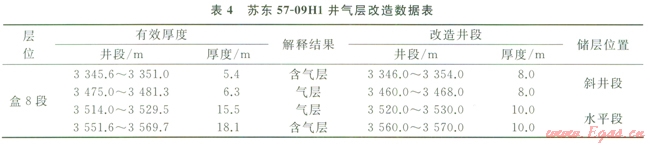 為實(shí)現(xiàn)多段儲層同時開發(fā),使用水平段裸眼封隔器+斜井段傳輸射孔組合工具進(jìn)行多段儲層壓裂改造,既提高了儲量動用程度,又提高了單井產(chǎn)量。以蘇里格氣田東區(qū)蘇東57-09H1井為例(表4),水平段有效儲層長度僅97m,通過縱向斜井段與水平段儲層多段同時改造,試氣獲得無阻流量36.4×104m3/d,取得了顯著效果。