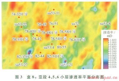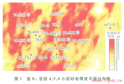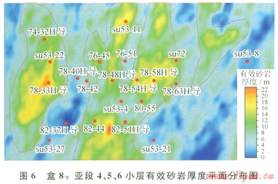 在有效厚度三維模型的基礎(chǔ)上,提取了各小層有效厚度的疊合圖,形成盒8下亞段4、5、6小層的有效厚度疊合圖(圖6),從平面上反映r有效儲層的分布范圍和趨勢。通過地質(zhì)建模預(yù)測盒8下亞段4、5、6小層累計有效砂巖厚度為0~22m,基本呈連片分布,與沉積特征相一致,該區(qū)中部、南部及西部的78-33H導(dǎo)井區(qū)有效厚度最大,達到20m左右;低值區(qū)主要分布在蘇53-7井東部、82-37H導(dǎo)井區(qū)、蘇53-8井區(qū)附近等,有效厚度小于3m,反映了區(qū)內(nèi)氣藏的分布規(guī)律。