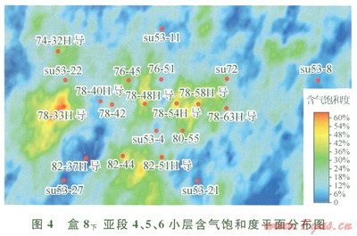 區(qū)塊含氣飽和度分布與滲透率分布類似(圖4),盒84、盒85、盒86小層發(fā)育程度較好,含氣飽和度較高的區(qū)域大部分集中在該區(qū)中部,達到50%,局部含氣飽和度超過高達80%。
