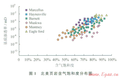 美國是頁巖氣開發(fā)利用最成功的國家,全美頁巖氣技術可采資源量為24.4×1012m3,投入商業(yè)開發(fā)的主要為海相頁巖,有Barnett、Marcellus、Antrim、Fayetteville、Woodford和Haynesville頁巖等[5]。2005年以來,隨著以水平井分段壓裂為代表的關鍵技術的突破,促進了美國頁巖氣產業(yè)的快速發(fā)展。據(jù)美國能源信息署預測,2015年美國頁巖氣產量將達到2600×108~2800×108m3,約占天然氣總產量的l/3[6-7]。北美地區(qū)凡是商業(yè)化的頁巖,其含水飽和度都很低,平均為l5%~35%[8-9],反之則含氣飽和度較高(圖1)。