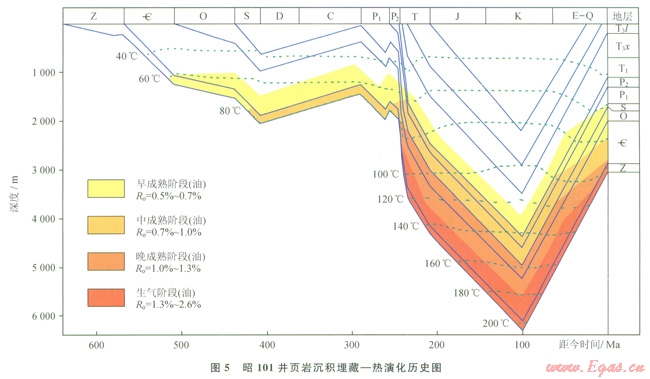 筆者以昭101井、l03等井為例開展了歷史模擬和流體包裹體分析,證實了斷裂對氣藏起強烈破壞這一判斷。昭通除靠近四川盆地的小部分區(qū)域外,多數(shù)鉆井都不成功,含氣量低(0.05~0.50m3/t)。昭通與蜀南相鄰,應該大致經歷了相似的演化歷程(圖5),含氣性差別大。昭101井位于芒部背斜,地表斷裂發(fā)育。目的層筇竹寺組因斷裂出現(xiàn)地層重復,頁巖裂隙發(fā)育、方解石充填嚴重,含氣量的現(xiàn)場分析結果不足0.1m3/t,評價為極低含氣量,基本全部逸散。開展的昭101井熱演化歷史和含氣量歷史模擬研究表明:昭通地區(qū)J-K末期含氣量最大,如果穩(wěn)定抬升頁巖將出現(xiàn)超壓,含氣量應該至少介于3~5m3/t,但是目前小于0.1m3/t(圖6)。