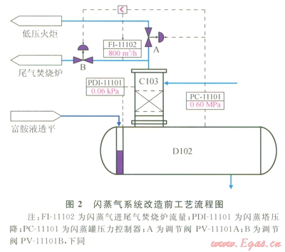 工藝改造前,來自液力透平的富胺液進(jìn)入閃蒸罐,在罐內(nèi)閃蒸出所攜帶的輕烴,閃蒸氣經(jīng)閃蒸氣吸收塔吸收所含H2S后分為兩路,一路到低壓火炬放空,另一路直接入尾氣焚燒爐F-403伴燒,其工藝流程如圖2所示。