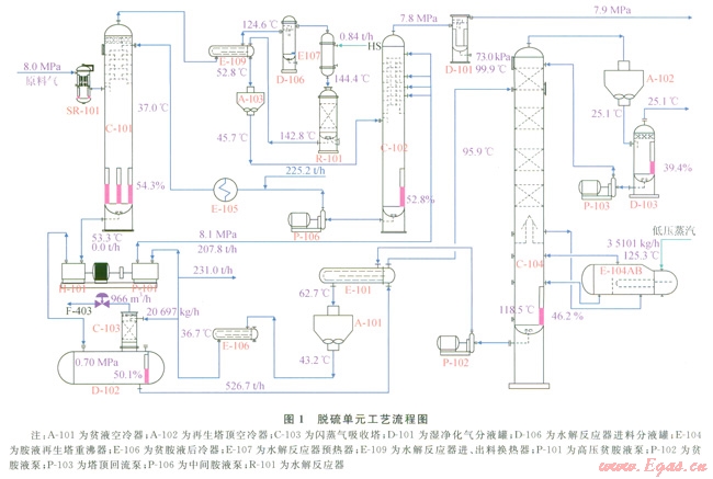 普光凈化廠引進(jìn)美國Black&Veatch公司專利技術(shù),以MDEA溶液作為吸收劑,采用兩級(jí)吸收、級(jí)間冷卻工藝選擇性吸收H2S,其工藝流程如圖l所示。經(jīng)過濾器(SR-l01)分離出的高含硫天然氣進(jìn)入一級(jí)吸收塔(C-101),與MDEA溶液在吸收塔內(nèi)逆流接觸,在二級(jí)吸收塔(C-102)底部用泵抽出半富胺液,經(jīng)過中間冷卻器(E-105),然后返回一級(jí)主吸收塔頂部,一級(jí)主吸收塔底部富胺液經(jīng)液力透平(H-101)回收能量后,進(jìn)入富胺液閃蒸罐(D-102),閃蒸后的胺液經(jīng)貧富胺液換熱器(E-101)換熱后進(jìn)入再生塔(C-l04)再生,再生后的貧胺液循環(huán)使用[2-4]。閃蒸出的氣體經(jīng)閃蒸塔吸收H2S后分兩路,少部分進(jìn)入尾氣焚燒爐伴燒,大部分放空至低壓火炬燒掉。