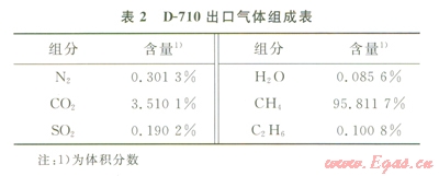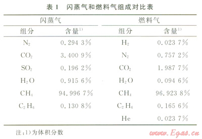 首先利用氣相色譜對(duì)閃蒸氣的組成進(jìn)行了分析,結(jié)果如表l所示。從分析結(jié)果可以看出,其主要成分是CH4,含量為94.9967%(體積分?jǐn)?shù)),通過表l的對(duì)比可以看出,閃蒸氣的組成和燃料氣的組成十分相近。