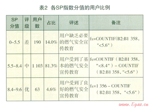 采用countif(range,criteria)統(tǒng)計程序,按燃氣知識教育強度(SP)評級,對有效問卷的l 357位用戶進行分類統(tǒng)計得出表2統(tǒng)計結(jié)果: