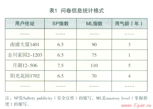 問卷打分采取手工模式,問卷數(shù)據(jù)記錄及統(tǒng)計采用Microsoft Excel,運用軟件中的批量求和程序?qū)?shù)據(jù)進行簡單處理,得出每一個用戶用于表征“燃氣安全宣傳強度”及“燃氣知識掌握狀況”的參數(shù)。統(tǒng)汁格式如表1所示: