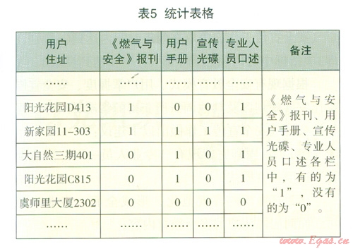 本次問卷中涉及的燃氣安全宣傳知識包括:《燃氣與安全》報刊、用戶手冊、宣傳光碟、工作人員口述。首先通過手工錄入到EXCEL中。如表5: