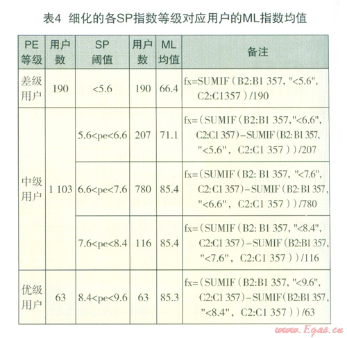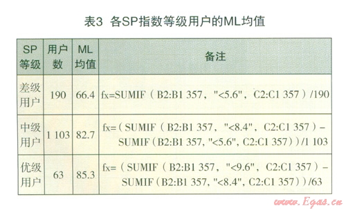 研究方法:對3種SP指數(shù)等級的用戶進行統(tǒng)計,分別計算出ML指數(shù)的平均值,再根據(jù)獲得的結(jié)果進行分析。統(tǒng)計采用SUMIF程序。如表3: