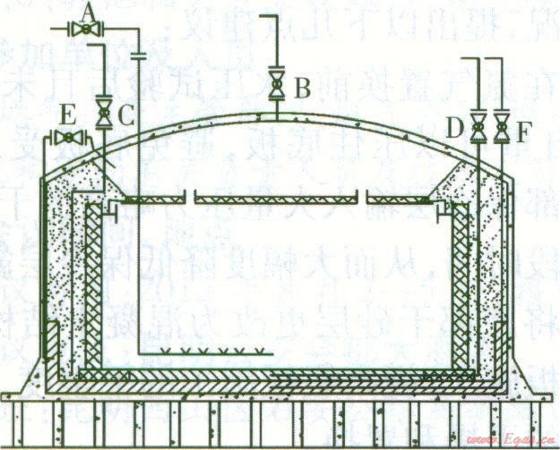 氮?dú)庵脫Q需先置換內(nèi)罐后置換環(huán)形空間,以避免置換過程中對內(nèi)罐壁板產(chǎn)生額外的壓力。置換管路見圖2。置換方法為:首先打開A閥和8閥,氮?dú)鈴腁閥進(jìn)入,進(jìn)行內(nèi)罐和拱頂?shù)闹脫Q;然后關(guān)閉B閥,打開c閥進(jìn)行環(huán)形空間的置換;接著關(guān)閉c閥,打開D閥進(jìn)行內(nèi)罐罐底干砂層的置換;最后關(guān)閉D閥,打開E閥和F閥進(jìn)行底部保冷空間的置換[8]。