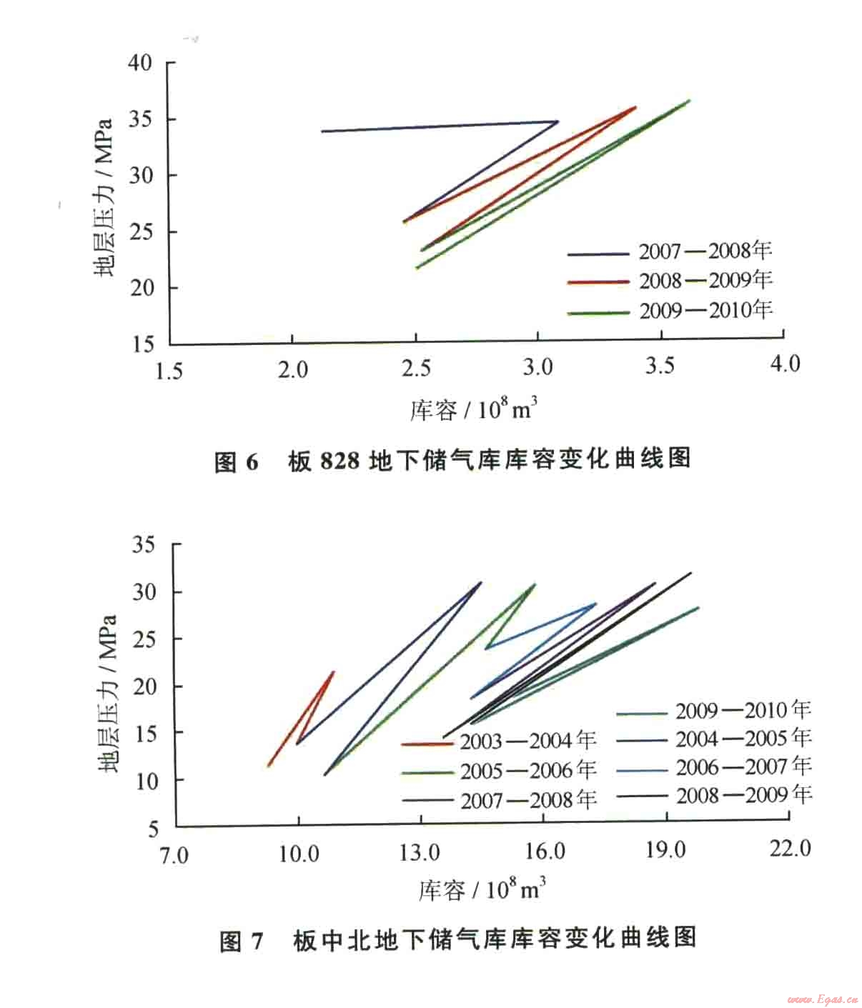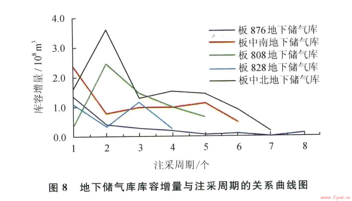 1)地下儲氣庫庫容量呈現(xiàn)逐漸增加的趨勢,并最終趨于最大庫容量。以注氣期結(jié)束時的庫容量為地下儲氣庫的當(dāng)期庫容量,采氣期結(jié)束時的庫容量為地下儲氣庫的當(dāng)期墊氣量,庫容量與墊氣量之差即為當(dāng)期工作氣量(采氣量)。從地下儲氣庫的實(shí)際庫容量變化曲線看(圖3~7),隨著地下儲氣庫注采周期的增加,庫容曲線普遍右移,地下儲氣庫庫容明顯增大,而且注采周期越多,庫容增加愈多。板876地下儲氣庫運(yùn)行5~8個注采周期時,庫容變化曲線基本重疊,表明地下儲氣庫已達(dá)到最大庫容量。由此也說明地下儲氣庫達(dá)容是一個長期的過程。從已建地下儲氣庫的達(dá)容特征看,水淹型地下儲氣庫的達(dá)容周期超過5年。