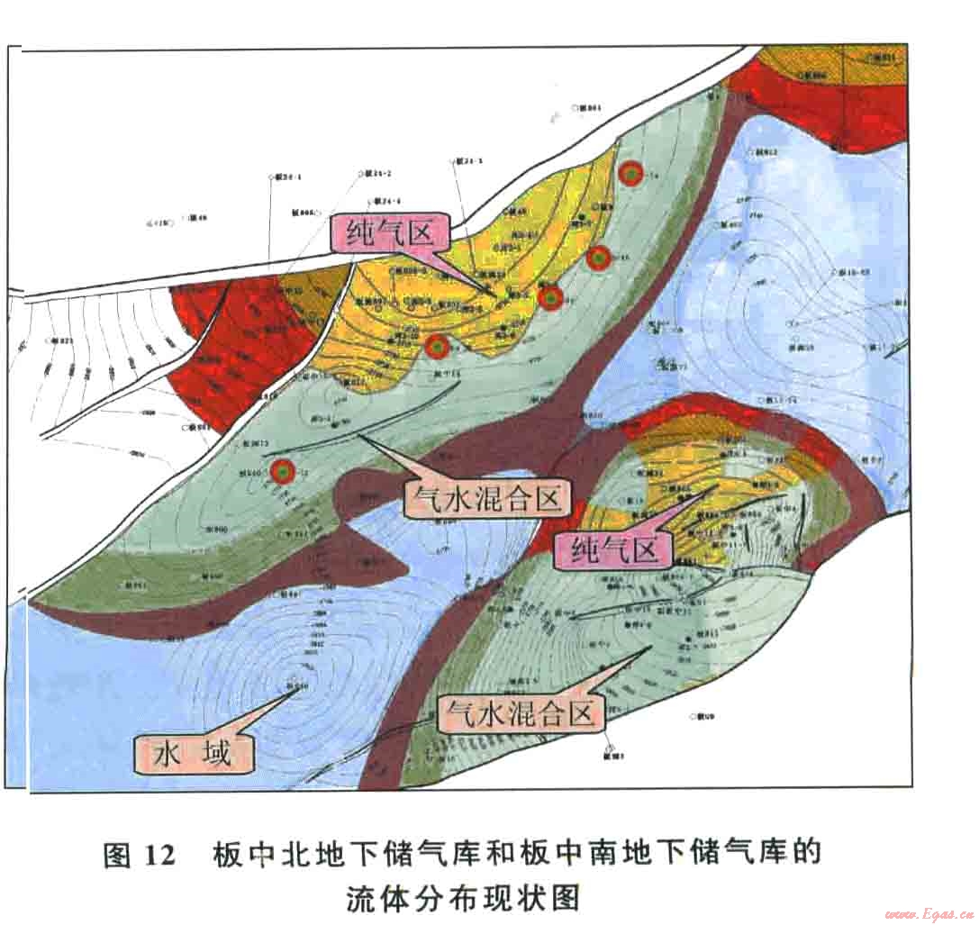 地下儲氣庫的構(gòu)造特征影響著達(dá)容的速度。對于完整的背斜或單斜構(gòu)造型地下儲氣庫,邊部水體在建庫前的氣藏開采階段,由低向高的水侵結(jié)果通常使低部位含水多高部位含水少,流體分布遵循上輕下重的重力分異規(guī)律。當(dāng)?shù)叵聝鈳觳扇∮筛呦虻偷淖怛?qū)水達(dá)容方案時,這種規(guī)律性表現(xiàn)得更突出,這是由實(shí)踐證實(shí)的普遍性規(guī)律。板中北高點(diǎn)地下儲氣庫7個注采周期后的流體分布狀態(tài)如圖l2所示。對于內(nèi)部存在較多斷層的破碎型地下儲氣庫,由于斷層的阻隔作用,只能形成局部性的小單元注氣驅(qū)水達(dá)容過程,通常由于范圍小、井?dāng)?shù)少,無法實(shí)現(xiàn)高部位注氣向低部位驅(qū)水的理想過程,造成小單元內(nèi)氣水分布混雜、驅(qū)水達(dá)容效果差,進(jìn)而影響到整個地下儲氣庫驅(qū)水達(dá)容的效果。如板中南地下儲氣庫整體形態(tài)為一背斜構(gòu)造(見圖12),但由于內(nèi)部發(fā)育有5條小斷層,造成多個小單元自成系統(tǒng),難以實(shí)現(xiàn)完善的氣體驅(qū)水注采關(guān)系,影響了達(dá)容效率,延長了達(dá)容時問。板中南地下儲氣庫5個注采周期后的流體分布狀態(tài)如圖l2所示。