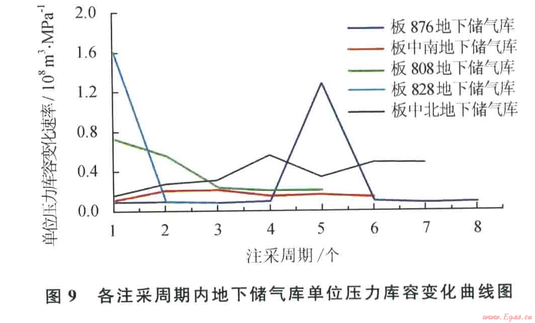 盡管地下儲氣庫的達(dá)容過程具有前快后慢的特點(diǎn),但地下儲氣庫從第2注采周期開始,單位壓力下庫容的變化量即彈性庫容率卻基本維持在一個穩(wěn)定值,盡管不同地下儲氣庫的該數(shù)值不同,但同一地下儲氣庫彈性庫容率基本穩(wěn)定的規(guī)律相同。地下儲氣庫單位壓力庫容變化曲線圖9所示。同理,在圖3~7中每個地下儲氣庫不同注采周期的曲線斜率也基本相同,反映每一個地下儲氣庫在壓力運(yùn)行區(qū)間內(nèi)單位壓力變化所波及的有效孔隙空間容積基本不變。由此推測,實(shí)際上地下儲氣庫內(nèi)的氣水與地下儲氣庫外部的弱水體總體上組成了同一氣水系統(tǒng),類似于定容氣水系統(tǒng)的特征。以板876地下儲氣庫為例,在地下儲氣庫生產(chǎn)運(yùn)行的8個注采周期中,除第5注采周期生產(chǎn)管理因素外,其余各注采周期的彈性庫容率基本相同,無論庫容增速快慢或庫容量大小變化,但彈性庫容率卻基本不變。但板中北地下儲氣庫卻是個特例,其具有較強(qiáng)的邊部水體,在地下儲氣庫生產(chǎn)運(yùn)行的7個注采周期中,隨著注采周期增加庫容量逐漸增大,同期彈性庫容率也逐漸增大,反映了強(qiáng)邊水地下儲氣庫的庫容率變化規(guī)律。