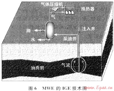 工藝流程:先將高溫蒸汽注入油頁巖地層中,對流加熱油頁巖,與油頁巖換熱后,把熱解生成的油氣載到地面上來,冷凝、回收。分離后的不凝氣被加熱到一定溫度后通入到地層與油頁巖換熱,循環(huán)利用(圖6)。MWE公司稱,該工藝中1口井的覆蓋面積可達3000m2,產(chǎn)油超過8100t/a[12]。