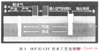 該工藝流程(圖3)為:利用高溫燃料電池堆的反應熱直接加熱油頁巖層,使其中的有機質熱解產(chǎn)生烴氣,然后導入到采油井,被抽到地面上來。除了部分氣體作為燃料被通入燃料電池堆外,其余大部分烴氣經(jīng)冷凝后獲得石油和天然氣。另外,在啟動工藝裝置預熱油頁巖時期,需要向燃料電池中通入天然氣作為啟動燃料。工藝正常運轉后,能量自給自足[9]。