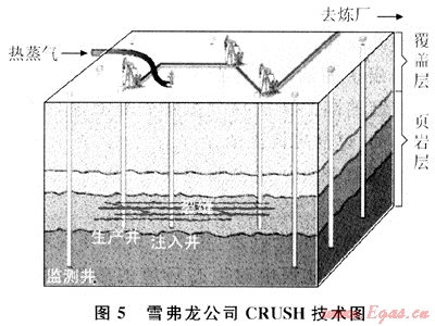 2006年,雪弗龍公司和Los Alamos國家實驗室聯(lián)合開發(fā)了CRUSH技術,并將根據(jù)設計的含有2~5個四點井網(wǎng)單元的工業(yè)試驗模型,進行實驗室室內實驗和小規(guī)模的現(xiàn)場試驗。目前主要研究注入高溫CO2加熱油頁巖層技術(圖5)。該技術首先對頁巖層進行爆破壓裂,提高CO2與干酪根接觸的表面積,將CO2以對流的方式從豎直井導入,通過一系列水平裂縫加熱頁巖層。生成的烴氣經(jīng)垂直井采出。該技術是基于1950年代Sinclair油氣公司利用垂直井間自然和引導的裂縫開采地下干酪根的試驗開發(fā)的[12]??捣剖凸竞桶⒖藗惔髮W的研究表明:CO2是一種能使頁巖油很好回收的載體,并申請了專利[12]。該技術需要大量水,并進行現(xiàn)場生產(chǎn),對環(huán)境破壞較大[13]。