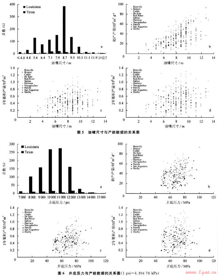 2) 水平段長度不是決定產(chǎn)能的唯一因素,也非越長越好。Louisiana和Texas州分別趨向于采用1500m和1650m水平段生產(chǎn)井開發(fā)頁巖氣。