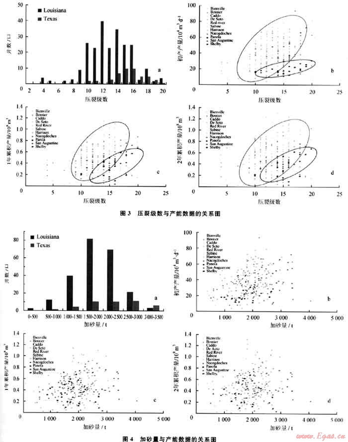 4) 加砂量多少與產(chǎn)能的關(guān)系較為復(fù)雜,受到水平段長度、壓裂級數(shù)和壓裂規(guī)模的影響。目前,Louisiana和Texas州分別多采用1500~2500t和1500~3000t兩種加砂量。