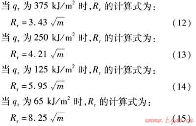 將已知參數(shù)代入式(12)~(15),可計(jì)算得到不同火球入射熱輻射劑量下的火球熱輻射半徑(見(jiàn)表4)。