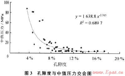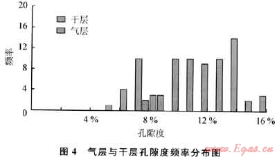 有效孔隙度下限確定有兩種方法:①根據(jù)壓汞資料,分析中值壓力與孔隙度的關(guān)系,當(dāng)孔隙度小于某一值時,中值壓力迅速增大,說明當(dāng)孔隙度小于該值時,汞基本壓不進(jìn),即這部分孔隙基本為無效孔隙[6~7](圖3),利用該法確定的研究區(qū)有效孔隙度下限為7%;②統(tǒng)計試油產(chǎn)層段與干層段孔隙度的分布特征來確定(圖4)。由圖3可知,干層和氣層孔隙度的分界線在7%左右,可見該區(qū)儲層有效孔隙度取7%比較合適。
