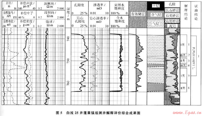白淺25井蓬萊鎮(zhèn)組井段746~754m,綜合分析該段為較純的細(xì)-中粒砂巖儲層,長石含量較高,粒度較細(xì),導(dǎo)致自然伽馬值極高(圖5),巖心分析孔隙度高達(dá)19.97%,平均值為16.72%。測井綜合分析處理后解釋了Ⅰ類、Ⅱ類和Ⅲ類氣層各2個(圖5)。738.4~756.5m井段測試產(chǎn)1.659×104m3/d工業(yè)氣流。