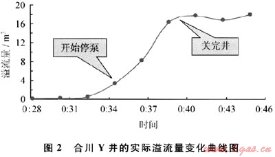 合川Y井:在半夜O0:35,溢流量由0.6m3增至3.4m3,準(zhǔn)備采取關(guān)井措施,直到00:39,關(guān)井才完成,期間耗費時間4min,溢流量由3.4m3增加到16.2m3,此時,循環(huán)排氣處理過程中,套壓上漲至16.9MPa,溢流變化情況如圖2所示。