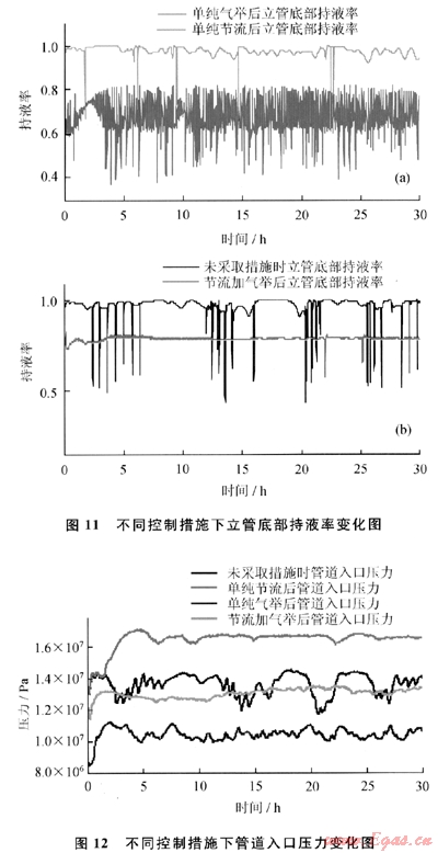 4)從模擬結(jié)果看,采取節(jié)流加氣舉法控制段塞流效果比單純節(jié)流或單純氣舉效果都更好,但提高油氣產(chǎn)量的效果不及單純氣舉法。當(dāng)氣舉氣源不是很充足時,可予以考慮。